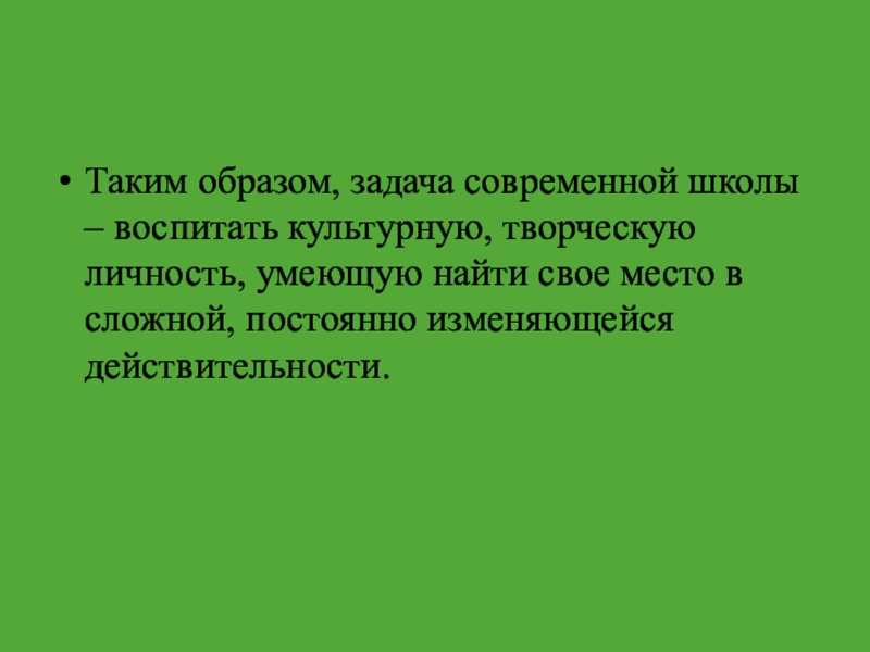 Таким образом, задача современной школы – воспитать культурную, творческую личность, умеющую найти свое место в сложной, постоянно