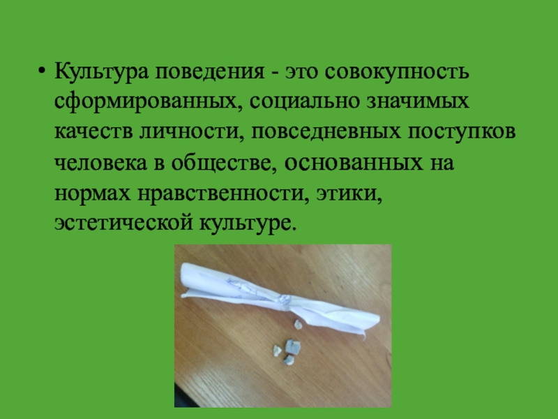 Культура поведения - это совокупность сформированных, социально значимых качеств личности, повседневных поступков человека в обществе, основанных на