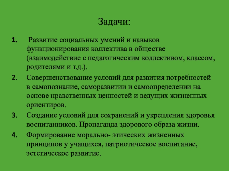 Задачи: Развитие социальных умений и навыков функционирования коллектива в обществе (взаимодействие с педагогическим коллективом, классом, родителями и