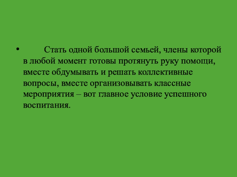 любой момент готовы протянуть руку помощи, вместе обдумывать и решать коллективные вопросы, вместе организовывать классные мероприятия – вот главное условие успешного воспитания.