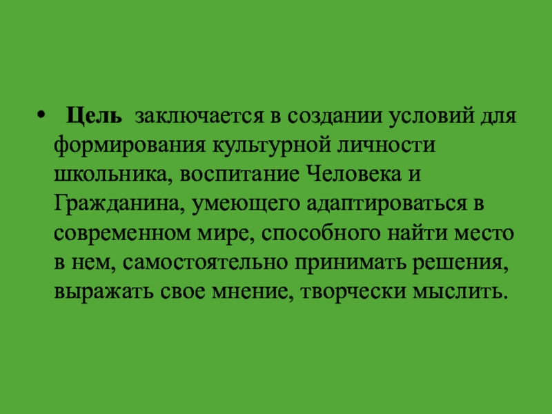 Цель  заключается в создании условий для формирования культурной личности школьника, воспитание Человека и Гражданина, умеющего адаптироваться в современном мире, способного найти место в нем, самостоятельно принимать решения, выражать свое мнение, творчески мыслить.