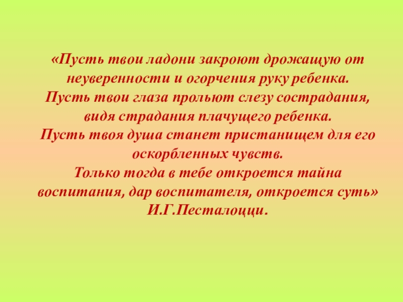 Пусть твоя душа станет пристанищем для его оскорбленных чувств. Только тогда в тебе откроется тайна воспитания, дар воспитателя, откроется суть» И.Г.Песталоцци.