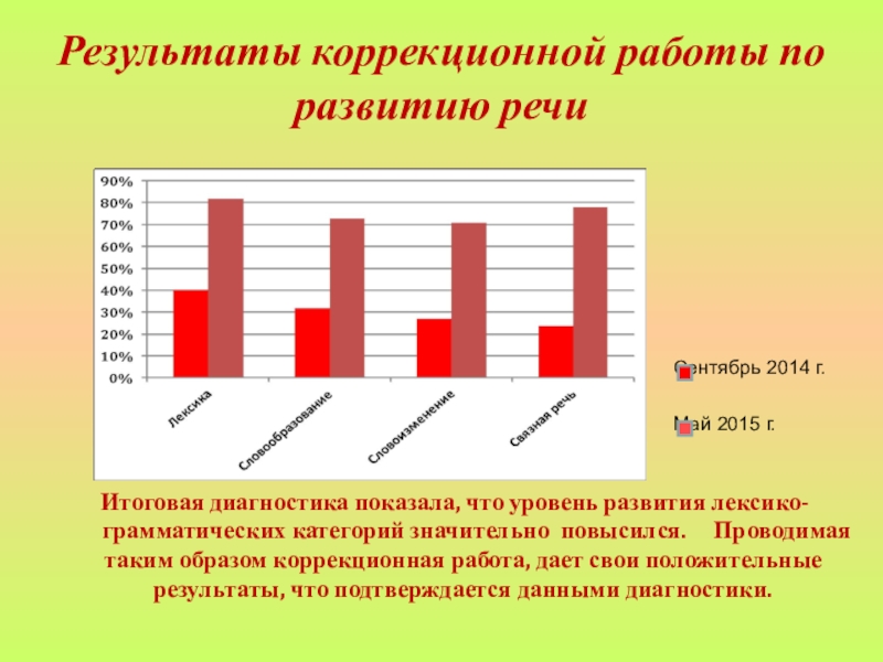 уровень развития лексико-грамматических категорий значительно повысился. Проводимая таким образом коррекционная работа, дает свои положительные результаты, что подтверждается данными диагностики.