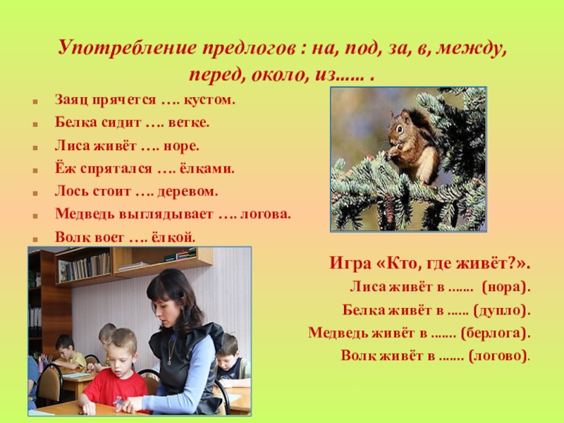 Слайд 24Употребление предлогов : на, под, за, в, между, перед, около, из......