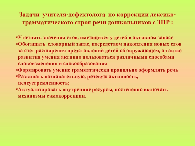Слайд 7Задачи учителя-дефектолога по коррекции лексико-грамматического строя речи дошкольников с ЗПР :