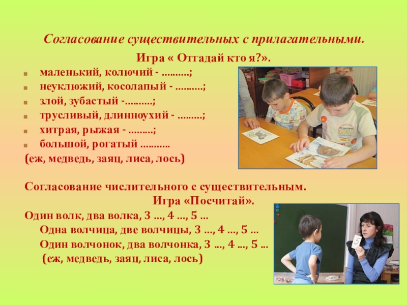 - усвоение навыка согласования существительных с прилагательными, числительными в роде, числе, падеже;