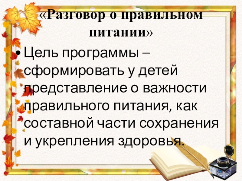 «Разговор о правильном питании»Цель программы – сформировать у детей представление о важности правильного питания, как составной части сохранения