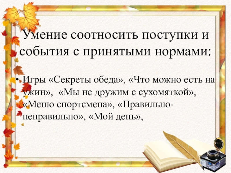 Умение соотносить поступки и события с принятыми нормами:Игры «Секреты обеда», «Что можно есть на ужин», «Мы не