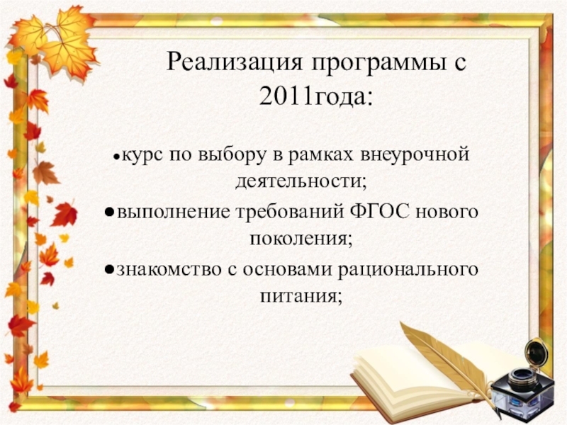 Реализация программы с 2011года:●курс по выбору в рамках внеурочной деятельности;●выполнение требований ФГОС нового поколения;●знакомство с основами рационального