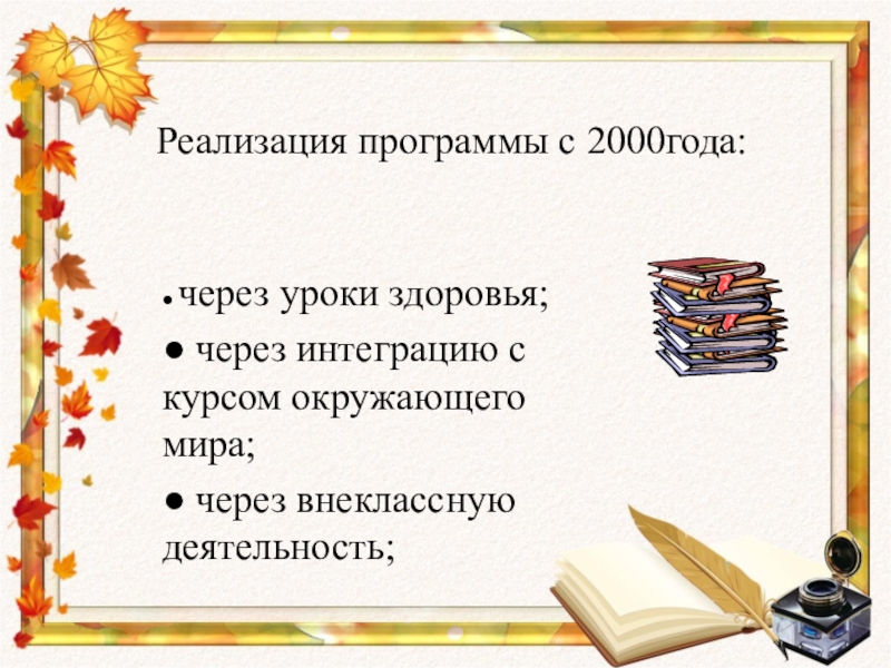 Реализация программы с 2000года: ● через уроки здоровья;● через интеграцию с курсом окружающего мира;● через внеклассную деятельность;