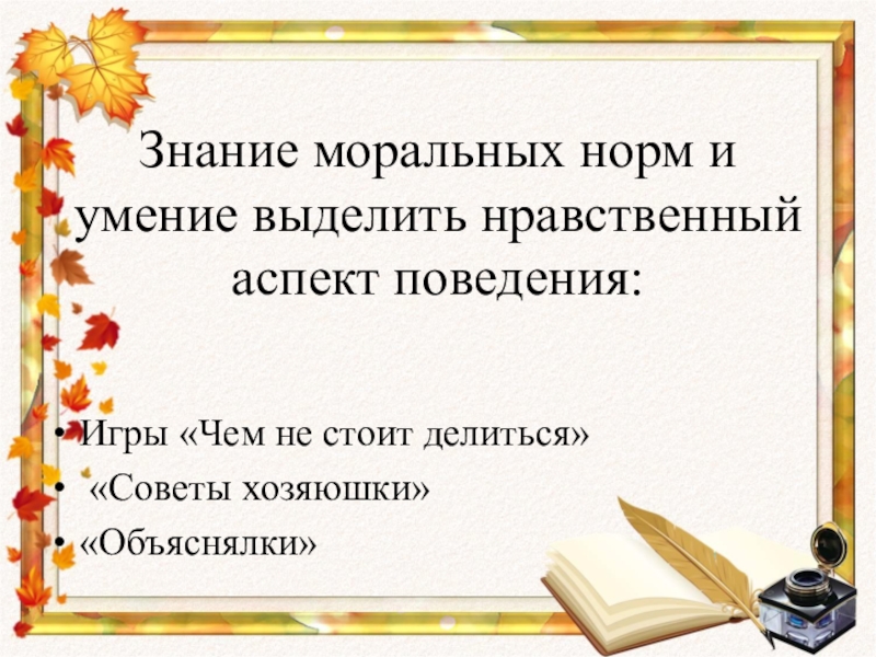 Слайд 10Знание моральных норм и умение выделить нравственный аспект поведения: