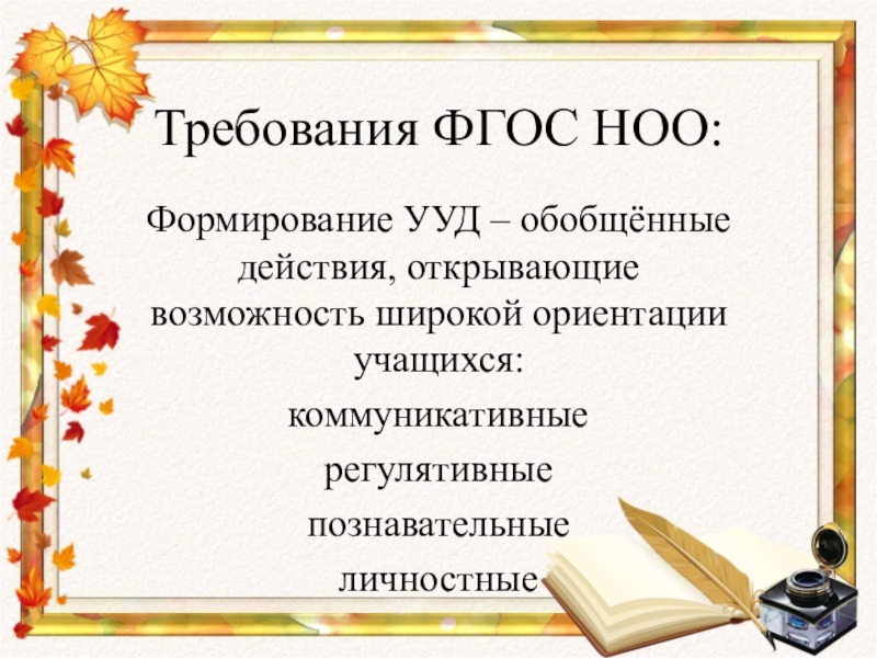Требования ФГОС НОО:Формирование УУД – обобщённые действия, открывающие возможность широкой ориентации учащихся:коммуникативныерегулятивныепознавательныеличностные