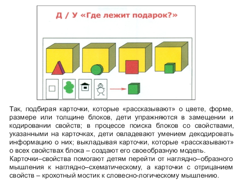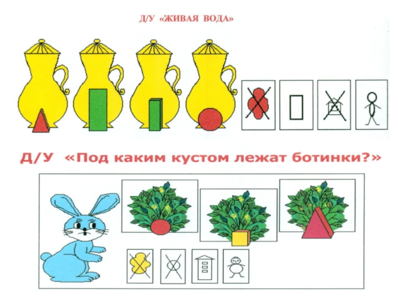 в) в сюжетно-ролевых играх: “Магазин” - деньги обозначаются блоками. “Почта” - адрес на доме обозначается кодовыми карточками. Аналогично, “Поезд” - билеты, места.
