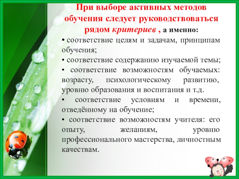 Слайд 10При выборе активных методов обучения следует руководствоваться рядом критериев , а именно: