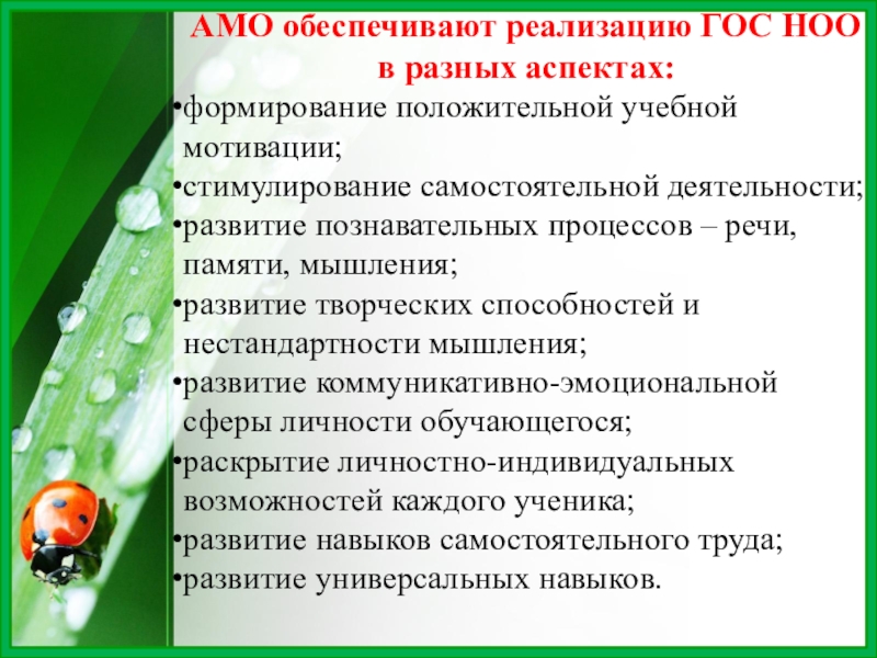 Слайд 8АМО обеспечивают реализацию ГОС НОО в разных аспектах: