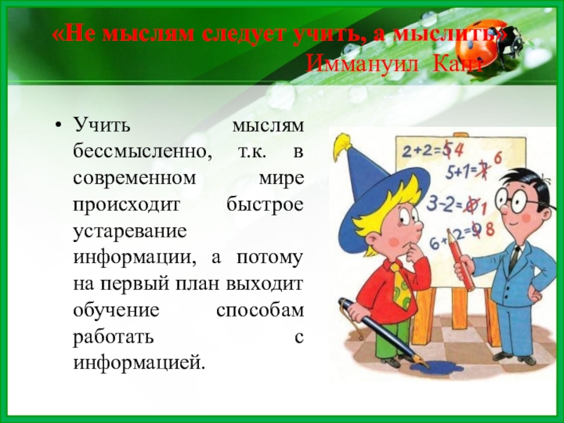 Учить мыслям бессмысленно, т.к. в современном мире происходит быстрое устаревание информации, а потому на первый план выходит обучение способам работать с информацией.