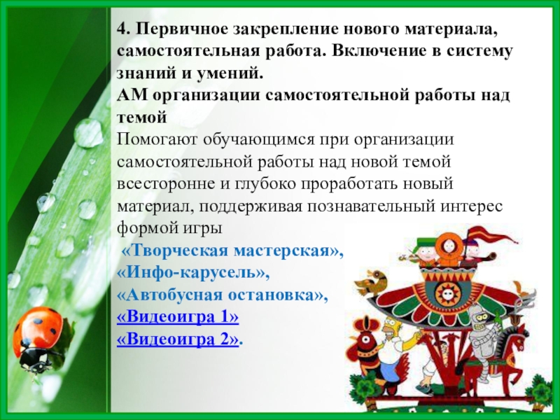 Помогают обучающимся при организации самостоятельной работы над новой темой всесторонне и глубоко проработать новый материал, поддерживая познавательный интерес формой игры