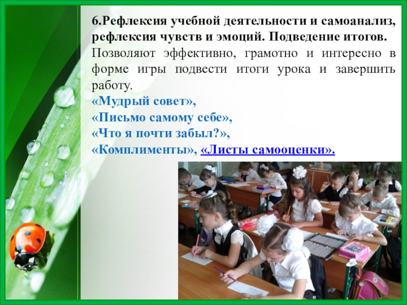 Слайд 166.Рефлексия учебной деятельности и самоанализ, рефлексия чувств и эмоций. Подведение итогов.