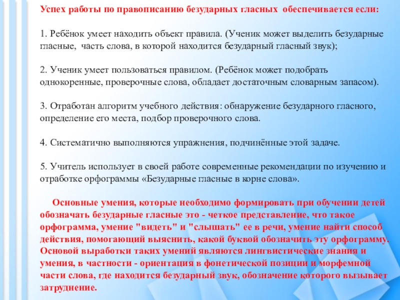 Успех работы по правописанию безударных гласных обеспечивается если: