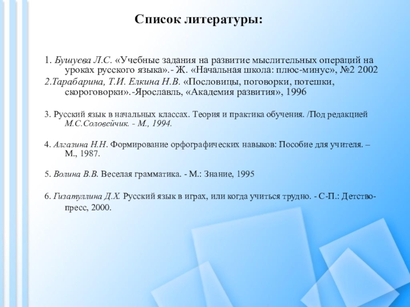 1. Бушуева Л.С. «Учебные задания на развитие мыслительных операций на