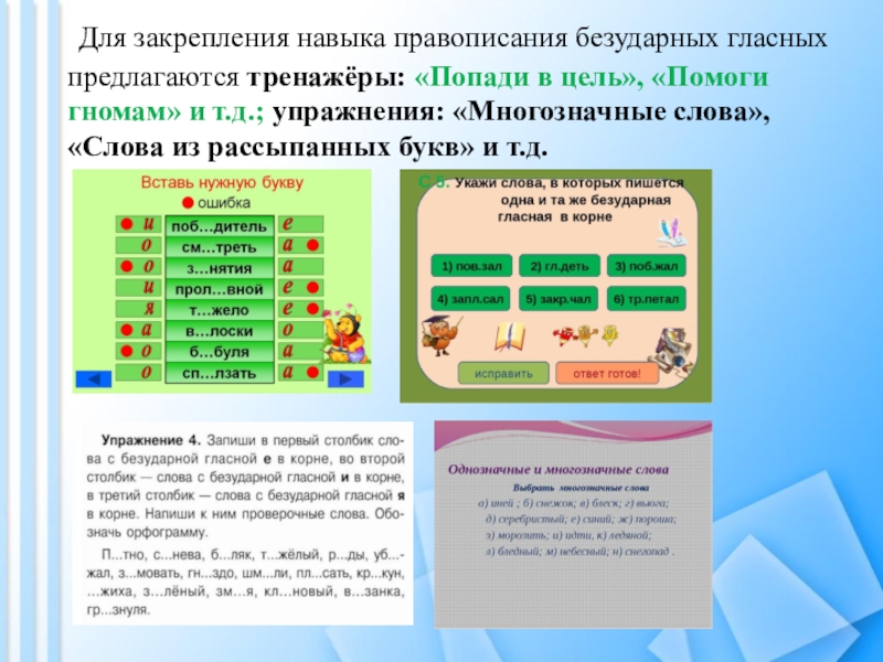 Слайд 8 Для закрепления навыка правописания безударных гласных предлагаются тренажёры: «Попади в