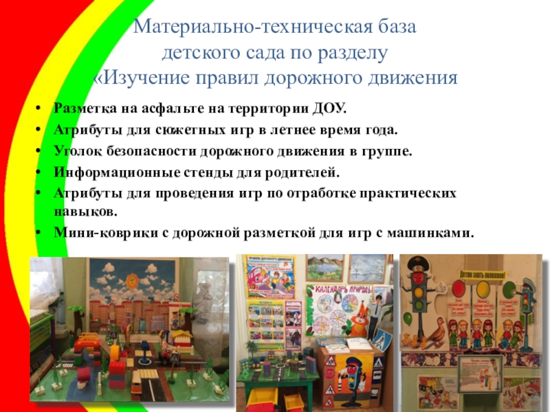 Слайд 17Материально-техническая база детского сада по разделу «Изучение правил дорожного движения