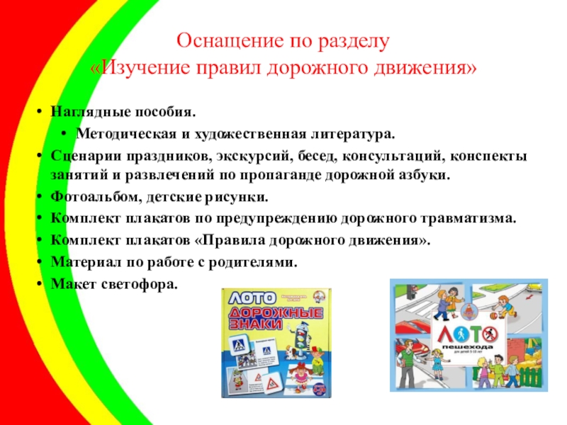 Оснащение по разделу «Изучение правил дорожного движения»Наглядные пособия.Методическая и художественная литература.Сценарии праздников, экскурсий, бесед, консультаций, конспекты занятий