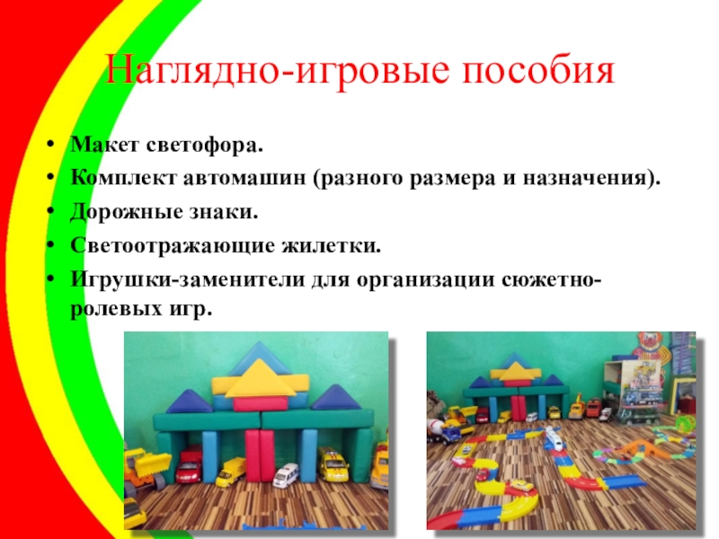 Наглядно-игровые пособияМакет светофора.Комплект автомашин (разного размера и назначения).Дорожные знаки.Светоотражающие жилетки.Игрушки-заменители для организации сюжетно-ролевых игр.