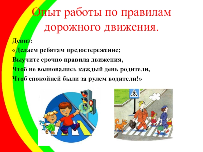 Опыт работы по правилам дорожного движения.Девиз:«Делаем ребятам предостережение;Выучите срочно правила движения,Чтоб не волновались каждый день родители,Чтоб спокойней были за рулем водители!»