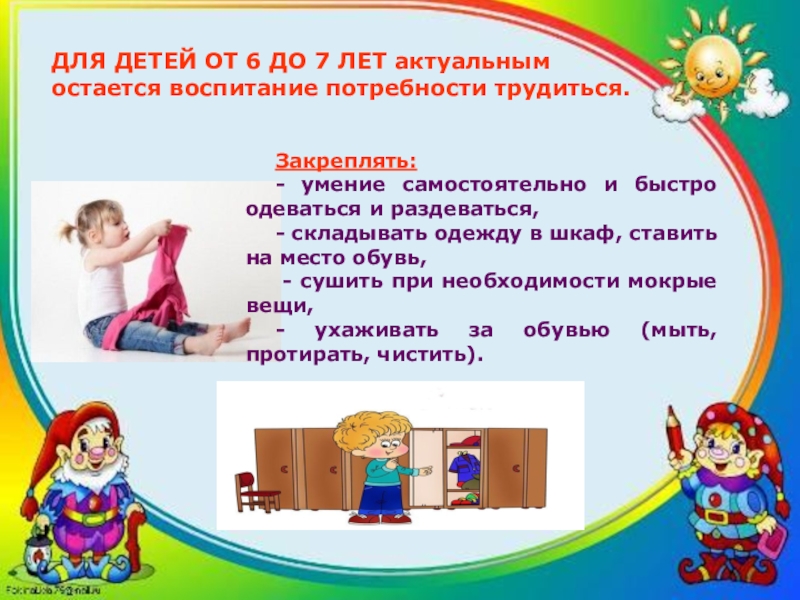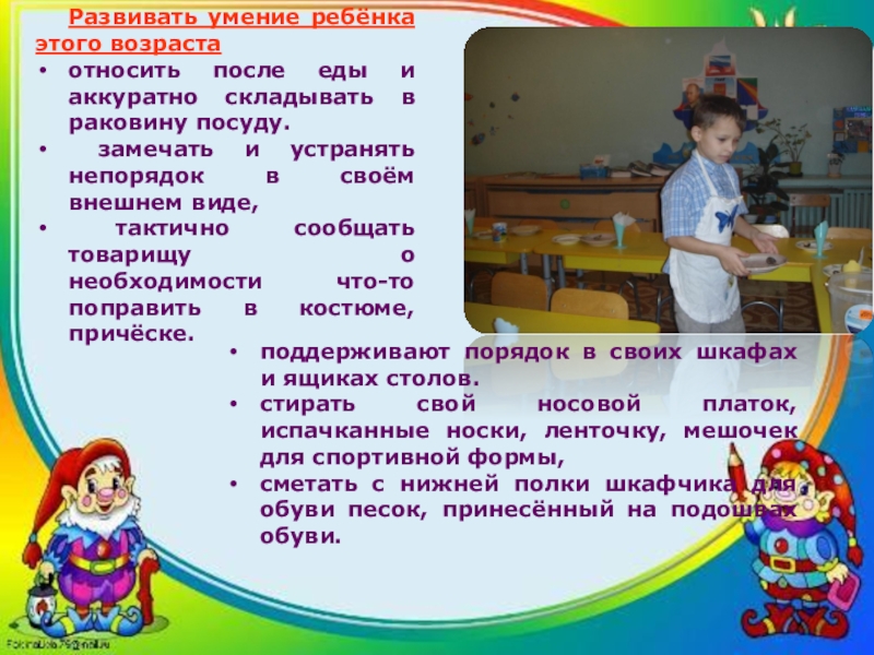 аккуратно складывать и вешать одежду, с помощью взрослого приводить её в порядок (чистить, просушивать)