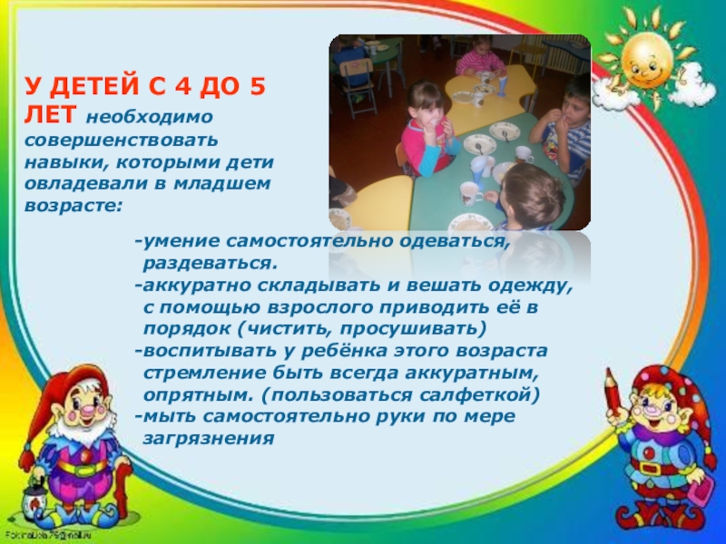 - гигиены тела (мыть руки и лицо, вытирать их полотенцем, пользоваться носовым платком и салфеткой);