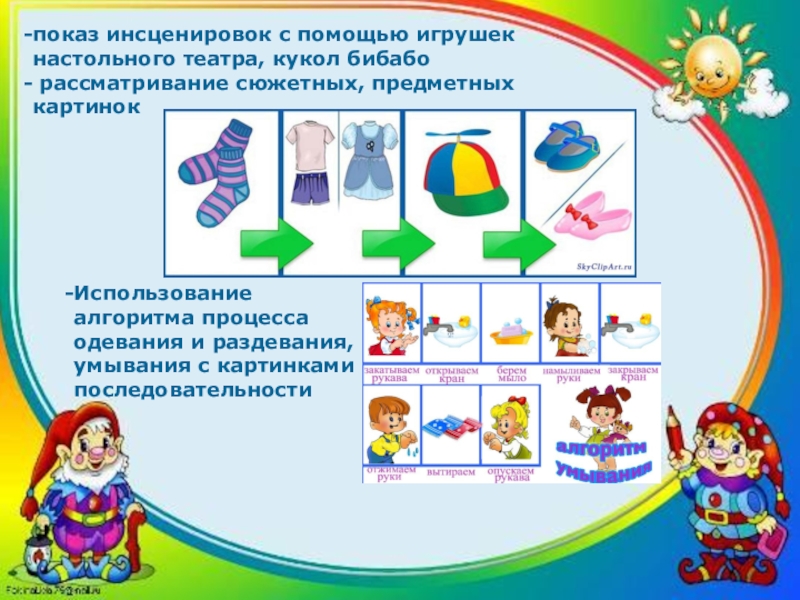 Использование алгоритма процесса одевания и раздевания, умывания с картинками последовательности