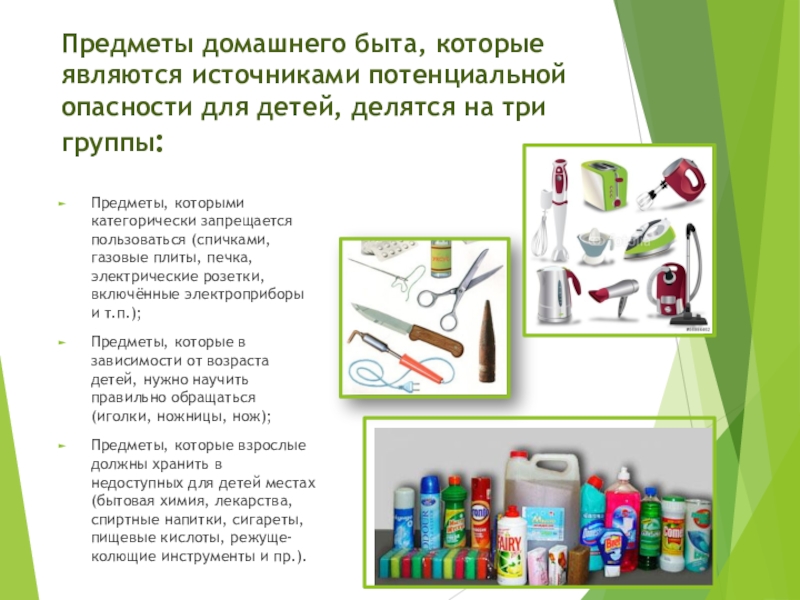Предметы, которые взрослые должны хранить в недоступных для детей местах (бытовая химия, лекарства, спиртные напитки, сигареты, пищевые кислоты, режуще-колющие инструменты и пр.).