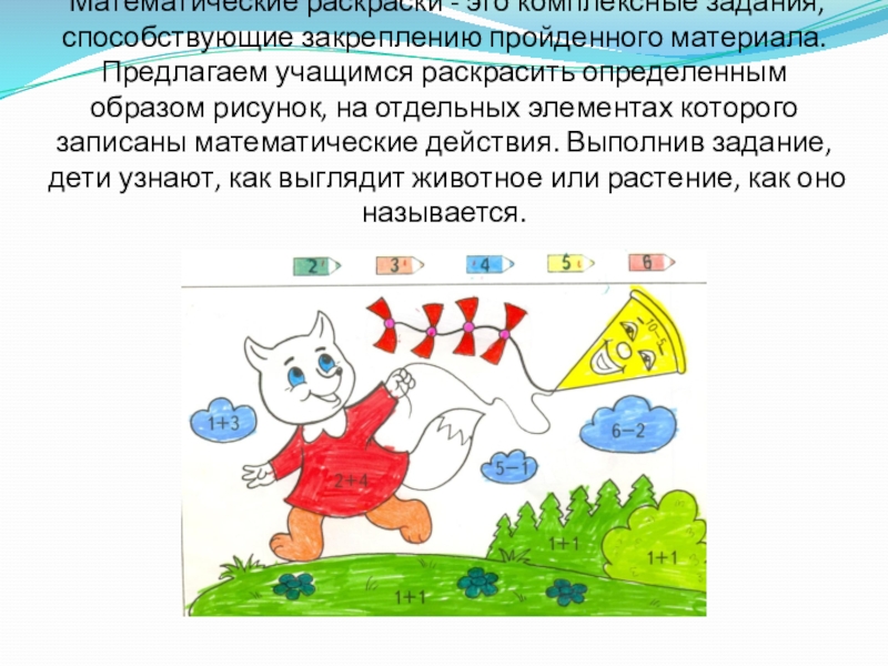 Слайд 15 Математические раскраски - это комплексные задания, способствующие закреплению пройденного материала.