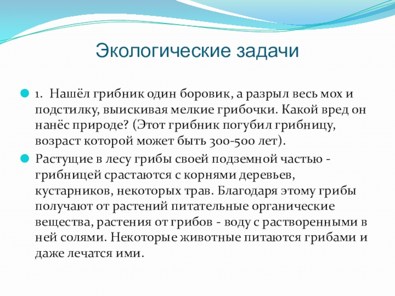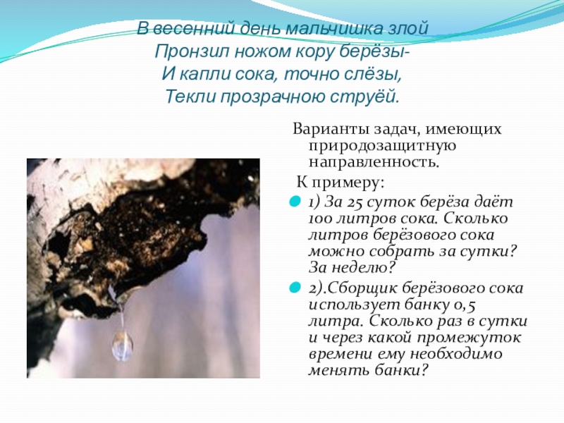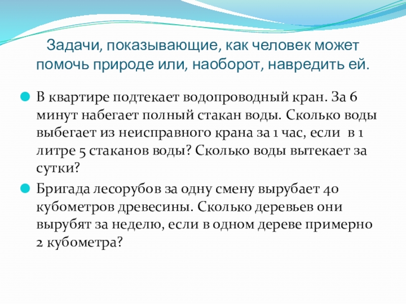Слайд 18Задачи, показывающие, как человек может помочь природе или, наоборот, навредить ей.