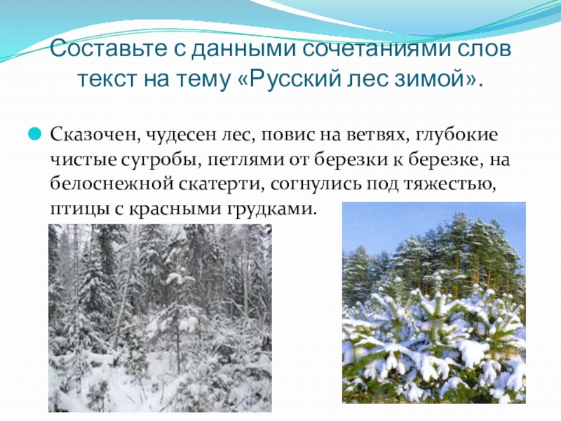 Слайд 25Составьте с данными сочетаниями слов текст на тему «Русский лес зимой».