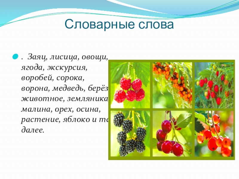 берёза, животное, земляника, малина, орех, осина, растение, яблоко и так далее.