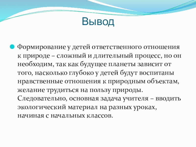 процесс, но он необходим, так как будущее планеты зависит от того, насколько глубоко у детей будут воспитаны нравственные отношения к природным объектам, желание трудиться на пользу природы. Следовательно, основная задача учителя – вводить экологический материал на разных уроках, начиная с начальных классов.