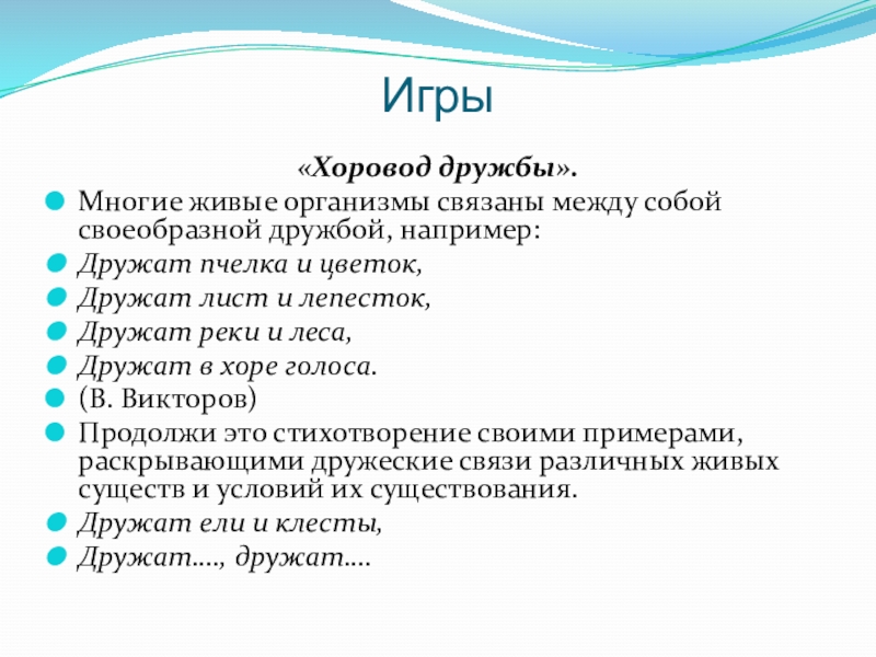 Продолжи это стихотворение своими примерами, раскрывающими дружеские связи различных живых существ и условий их существования.