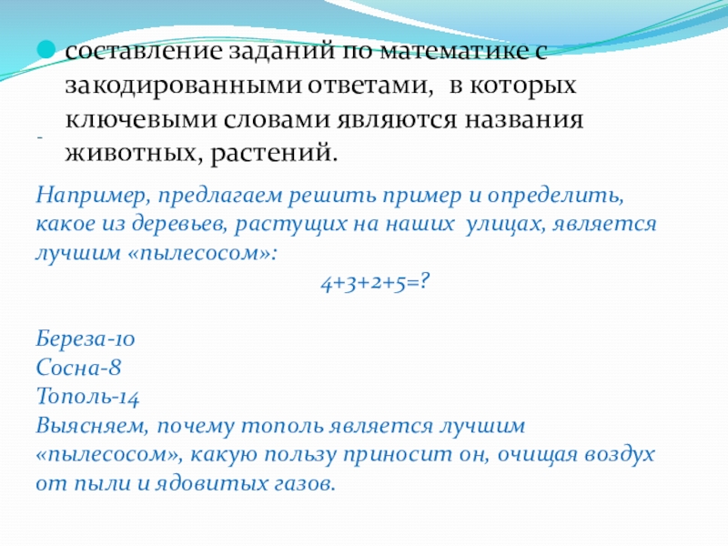 Например, предлагаем решить пример и определить, какое из деревьев, растущих на наших улицах, является лучшим «пылесосом»: