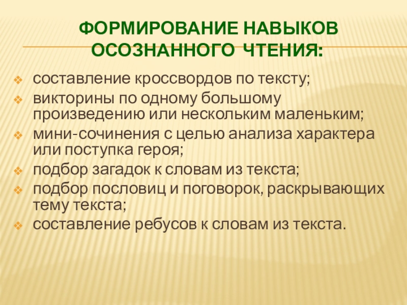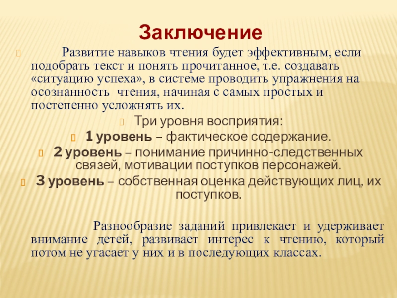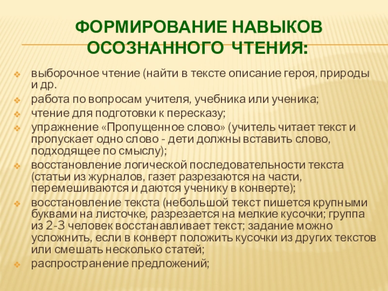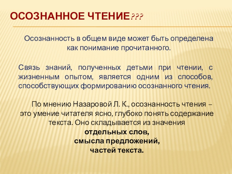 По мнению Назаровой Л. К., осознанность чтения – это умение читателя ясно, глубоко понять содержание текста. Оно складывается из значения