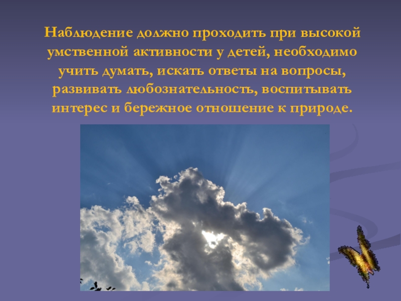 Слайд 12Наблюдение должно проходить при высокой умственной активности у детей, необходимо учить
