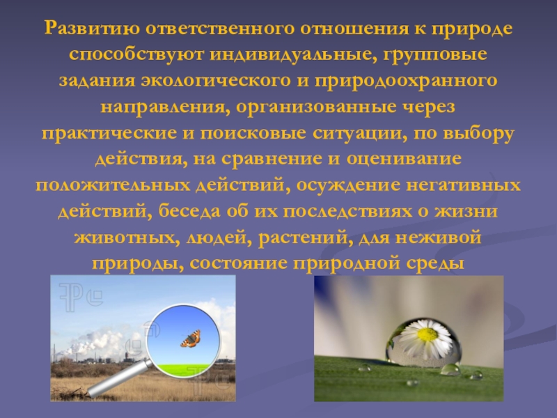 Слайд 5Развитию ответственного отношения к природе способствуют индивидуальные, групповые задания экологического и