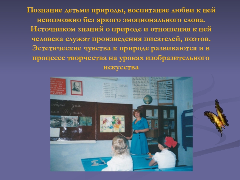 без яркого эмоционального слова. Источником знаний о природе и отношения к ней человека служат произведения писателей, поэтов. Эстетические чувства к природе развиваются и в процессе творчества на уроках изобразительного искусства