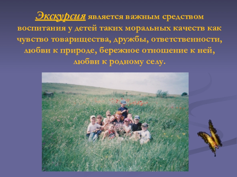 Слайд 8Экскурсия является важным средством воспитания у детей таких моральных качеств как