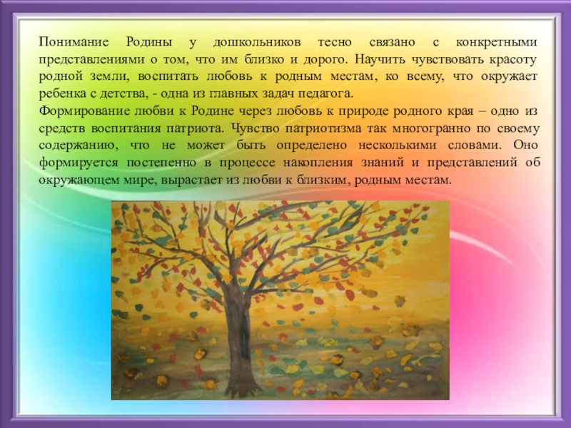 что им близко и дорого. Научить чувствовать красоту родной земли, воспитать любовь к родным местам, ко всему, что окружает ребенка с детства, - одна из главных задач педагога.