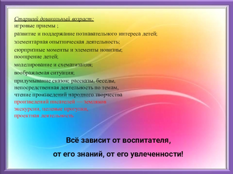 придумывание сказок; рассказы, беседы, непосредственная деятельность по темам, чтение произведений народного творчества произведений писателей — земляков
