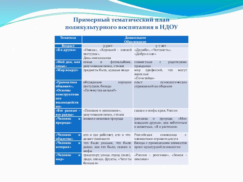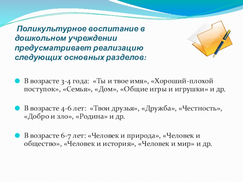 Слайд 10 Поликультурное воспитание в дошкольном учреждении предусматривает реализацию следующих основных разделов:
