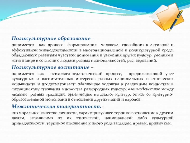 понимается как психолого-педагогический процесс, предполагающий учет культурных и воспитательных интересов разных национальных и этнических меньшинств и предусматривает: адаптацию человека к различным ценностям в ситуации существования множества разнородных культур; взаимодействие между людьми разных традиций; ориентацию на диалог культур; отказ от культурно-образовательной монополии в отношении других наций и народов.