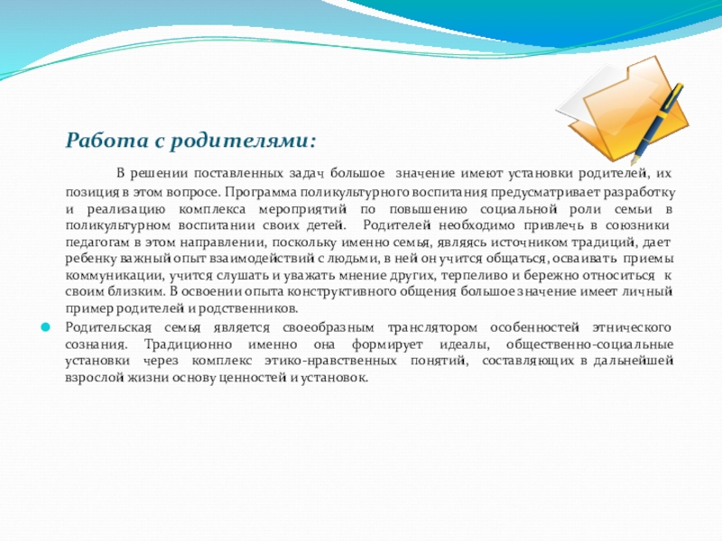 установки родителей, их позиция в этом вопросе. Программа поликультурного воспитания предусматривает разработку и реализацию комплекса мероприятий по повышению социальной роли семьи в поликультурном воспитании своих детей. Родителей необходимо привлечь в союзники педагогам в этом направлении, поскольку именно семья, являясь источником традиций, дает ребенку важный опыт взаимодействий с людьми, в ней он учится общаться, осваивать приемы коммуникации, учится слушать и уважать мнение других, терпеливо и бережно относиться к своим близким. В освоении опыта конструктивного общения большое значение имеет личный пример родителей и родственников.
